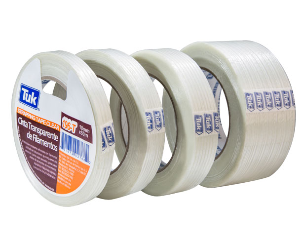 Cinta de polipropileno reforzada con filamentos de fibra de vidrio, con excelentes propiedades mecánicas como son la resitencia a la tensión y al corte, presenta una alta adhesión instantánea, así como un buen poder de retención. Los cambios dimensionales de la cinta son mínimos cuando es sometida a grandes esfuerzos. Disponible en medidas 12, 18, 24, 36 y 48mm.